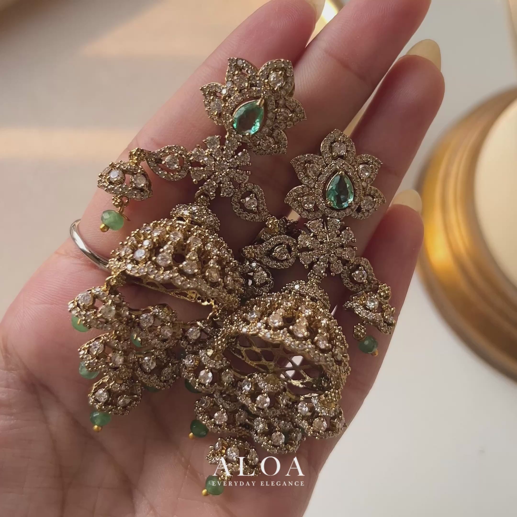 The crown of each earring is set with a striking pear-cut emerald green stone, framed by a delicate floral halo of brilliant Cubic Zirconia. The intricate, open-work gold-toned lattice of the bells is meticulously encrusted with round CZ stones, creating a shimmering lace effect. Finished with soft mint green beads that cascade from every tier, these earrings offer a sophisticated blend of traditional weight and contemporary color.