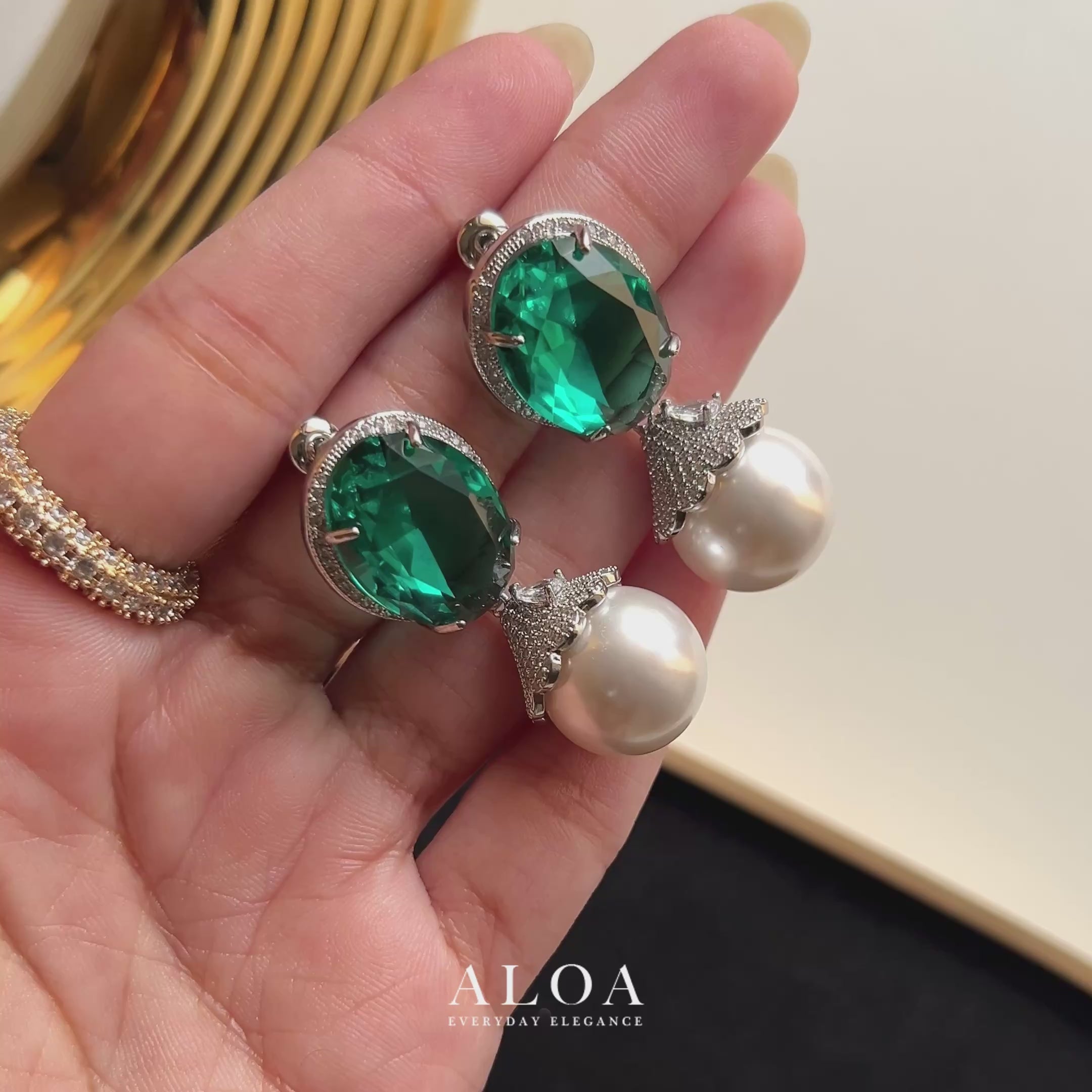 Suspended beneath the emerald stud is a magnificent lustrous white pearl, topped with an intricate, scalloped pavé cap. A tiny, pear-cut solitaire accent connects the two elements, adding an extra touch of sparkle and movement. These earrings are the ultimate accessory for formal galas, weddings, or any occasion where you want to channel royal-inspired glamour.