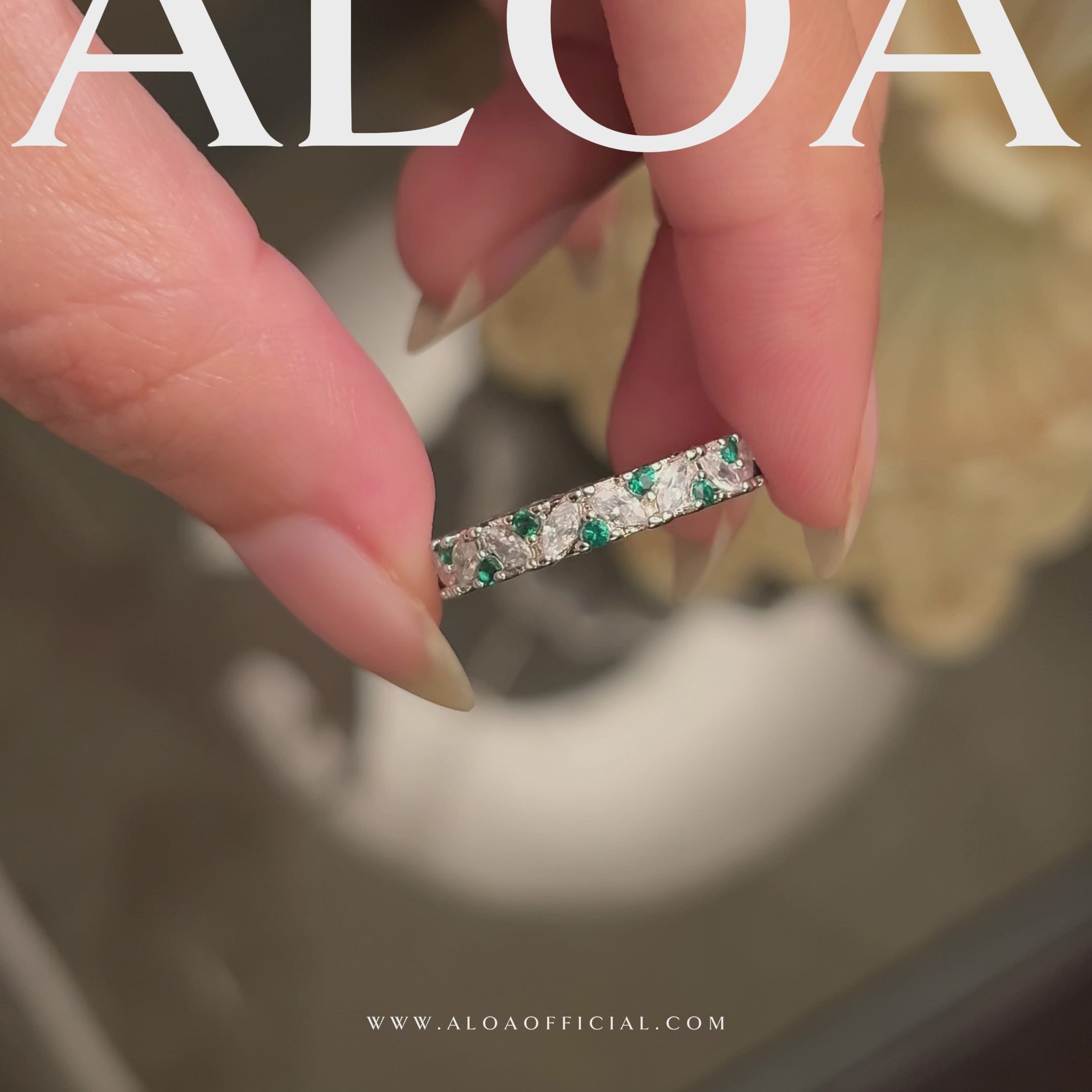 The design features a delicate alternating pattern of shimmering marquise-cut cubic zirconia and vibrant emerald-green round-cut stones, mimicking the grace of a flowering vine.