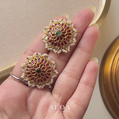 Inspired by heritage jewelry motifs, these floral earrings blend regal jewel tones with timeless elegance. The rich fuchsia petals are set in a golden framework, accented with shimmering crystals that catch the light from every angle. Finished with a pristine pearl-beaded edge, these studs offer a balanced silhouette that is both substantial and graceful.