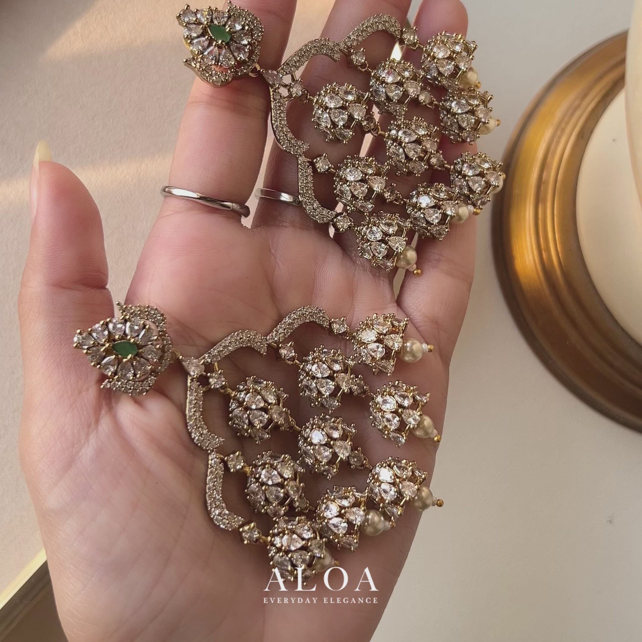 These chandelier earrings feature a wide, arched framework dripping with brilliant-cut stones that mimic a shower of starlight. The vibrant green center stone provides a high-fashion contrast, while the cascading pearlescent drops add a touch of classic sophistication. Perfect for brides, galas, or high-profile festive events.