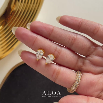 These pear-cut solitaire studs are an essential addition to any jewelry wardrobe. Each earring features a high-clarity teardrop-shaped cubic zirconia, masterfully faceted to capture and reflect light with exceptional brilliance.