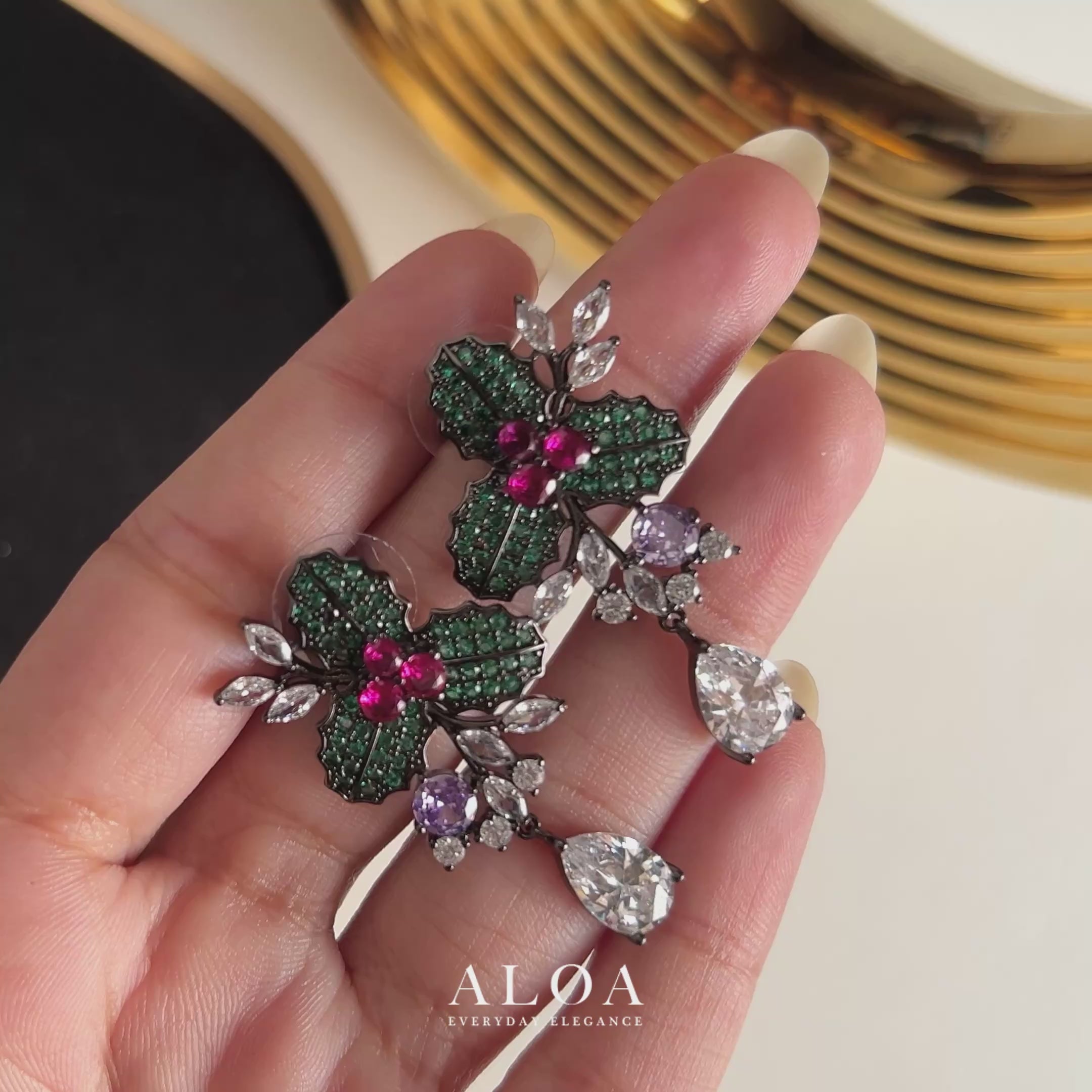 These striking dangle earrings feature a luxurious arrangement of colorful cubic zirconia stones set in a dark antique metal. The design resembles leaves and berries, giving them a perfect festive look.