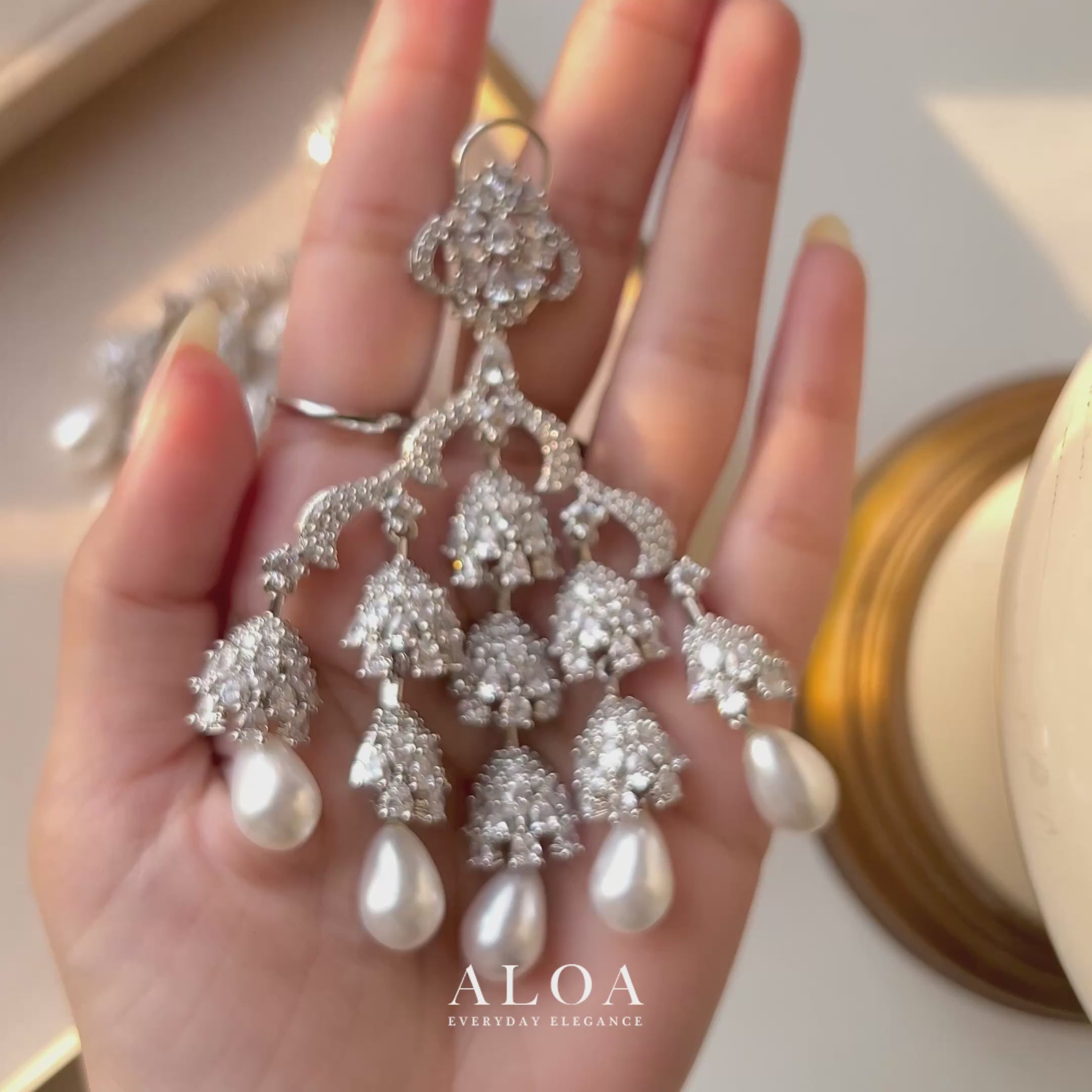 Crafted in a high-shine silver-polished finish, the intricate metalwork is densely encrusted with brilliant-cut Cubic Zirconia (CZ) stones that shimmer with every movement. The design culminates in a series of lustrous, teardrop pearl drops that add a soft, classic touch to the high-impact sparkle.