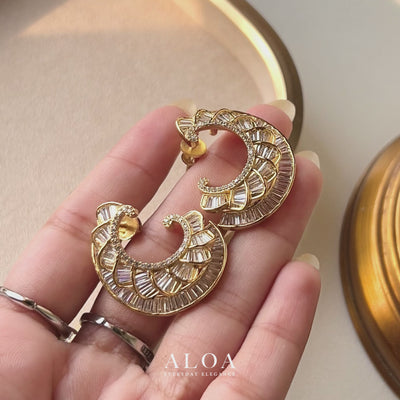 Featuring an intricate, 3D wave-inspired design, these wide-profile studs are a masterclass in jewelry craftsmanship. They are encrusted with multiple rows of baguette and round-cut CZ stones set within a heavy golden-polished frame. The sculptural, layered look provides a high-end feel, supported by a traditional screw-back for a stable and secure fit.
