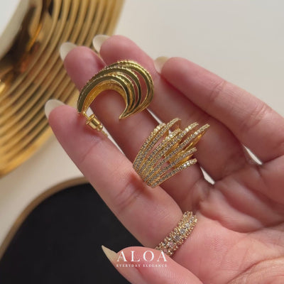 These earrings are expertly designed to mimic the appearance of multiple stacked earrings, this single pair features five individual graduated bands that sweep gracefully from the ear. Each band is meticulously encrusted with shimmering micro-pavé stones, catching the light from every angle.
