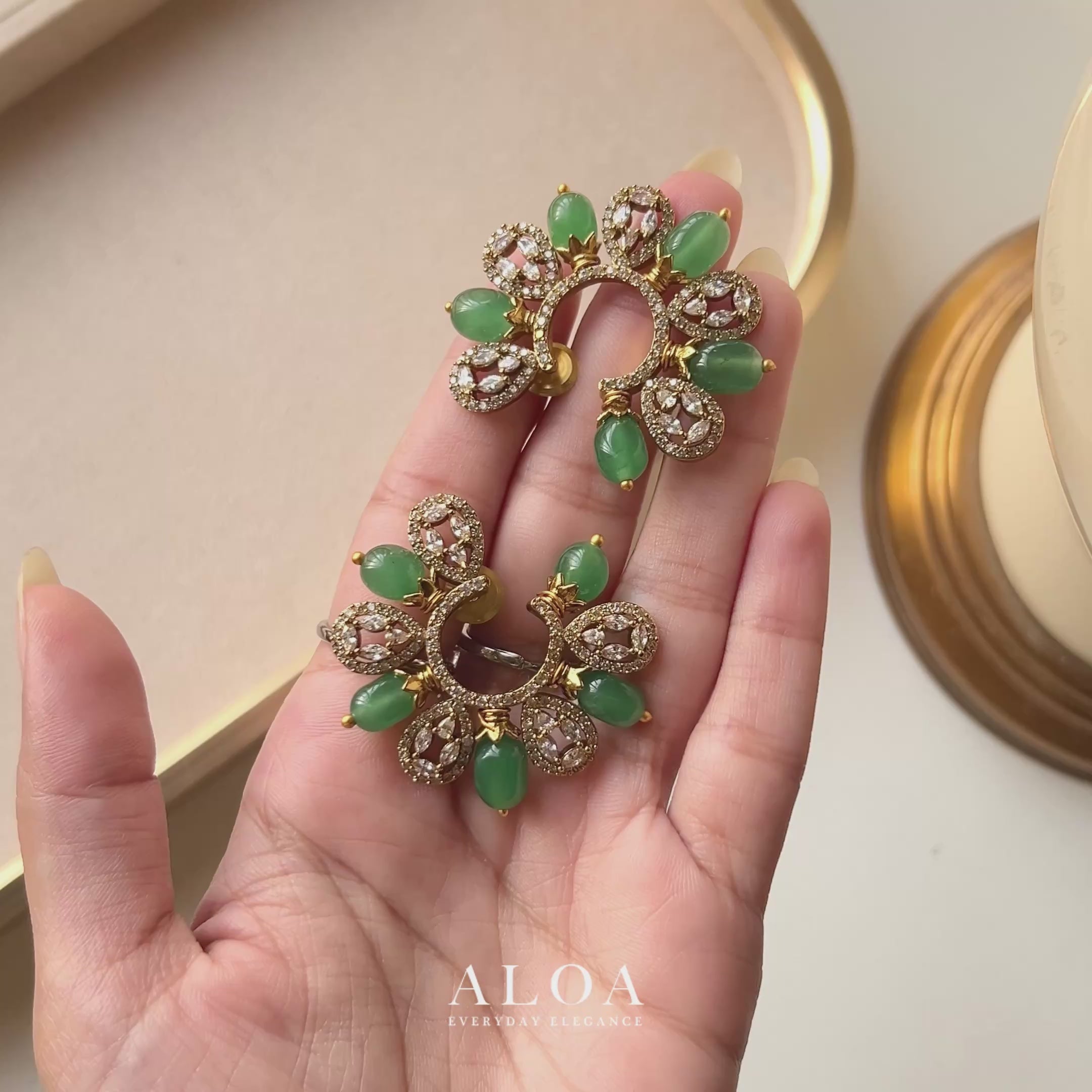 Nature meets high-fashion. These unique open-hoop earrings draw inspiration from blossoming petals, featuring smooth green stones that pop against a backdrop of shimmering pavé crystals. The architectural C-shape design creates a dramatic silhouette that frames the face beautifully, making them the ultimate centerpiece for your next special occasion.